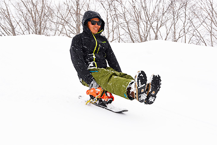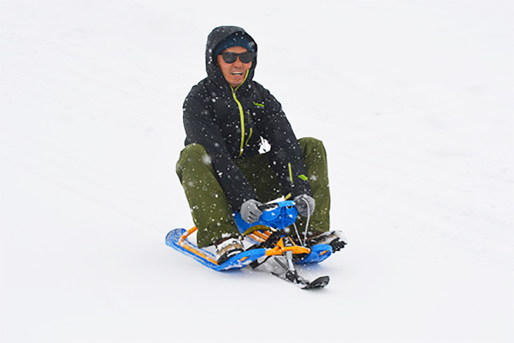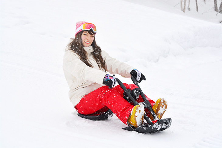 Sledding is prohibited on the ski runs, and is generally allowed only in the Kid's Park and other designated areas. The Minakami Kogen Ski Resort, however, has a Sled Ride Course made exclusively for sleds so you can rent sleds and enjoy downhill rides using the lift. The sled in the photograph is a Zipfy. Control your ride with the bar on the front and by transferring your weight.