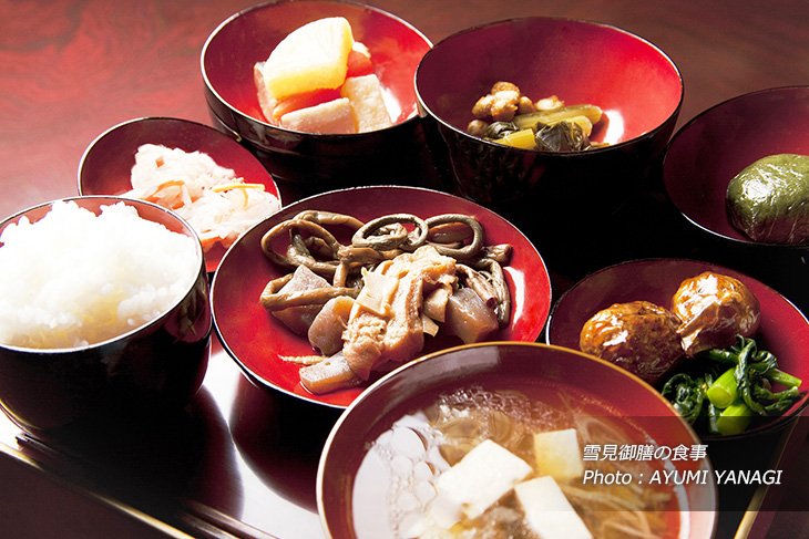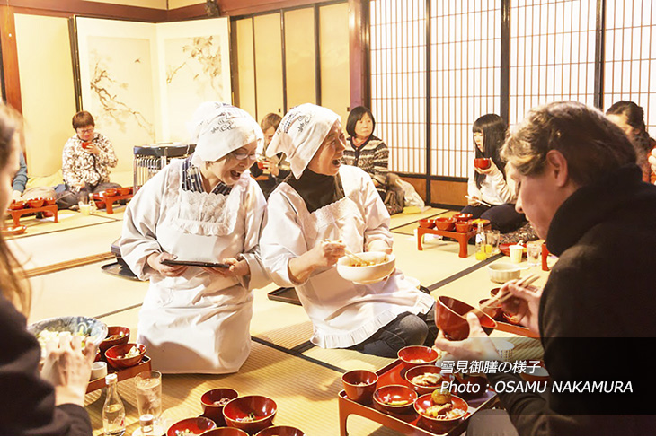 People in this region have lived with the wisdom and culture to survive and live in harmony with abundant snow. The food in the Yukimi Gozen lunch is designed not only to provide enough nutrition during harsh winters, but also tasty and filling. The rice, vegetables and mountain herbs used are all locally sourced. The contents of the lunch may slightly vary from village to village, but the lunch will be a fun experience warmed by hospitality from the locals.