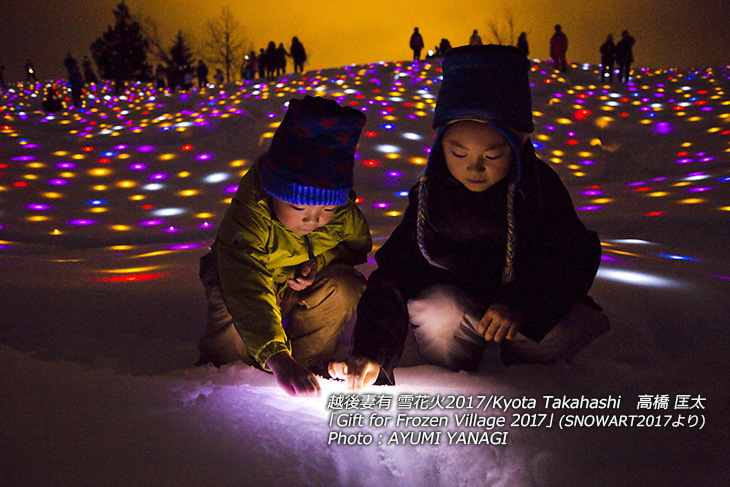 The last event of the tour is Echigo-Tsumari Snow Fireworks 2018, held at Atema Kogen Resort Belnatio. Themed on snow and light, and with "Gift for Frozen Village" produced by artist Kyota Takahashi, the usually monochrome snowscape will turn into a scene resembling countless flowerbeds on snow, thanks to colorful LED lights buried in the snow. As a participant of the tour, you'll also receive one LED light to bury in the snow!