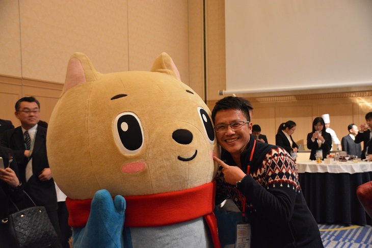 The local mascot character "Ezomon" for the Sapporo Asian Winter Games 2017 showed up. He walked around the party room and participants took pictures with him.