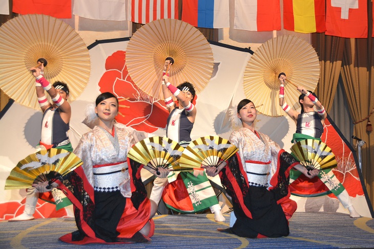"YOSAKOI Soran Festival", a local dance festival that is held around the Sapporo Odori Park every Summer, is a popular big event. The legendary team "Shinkotoni Tenburyujin" that has a history of winning the contest in the "YOSAKOI Soran Festival" four years in a row from 2004, showed their dance performance at the party. The dance is Japanese style but the music is jaunty, and the room atmosphere was lively once performers started dancing with gorgeous dresses.