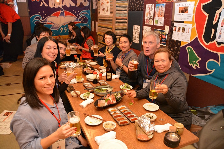 Participants hung out in Sapporo city and experienced local foods at night. Participants picked their favorite one to go among options of sushi, Korean BBQ, Genghis-Khan Mongolian BBQ, Ishikari hot pot, traditional ash grill, and izakaya style restaurants. The picture shows the group who went to an izakaya style restaurant. This kind of local Japanese atmosphere is novel to foreign visitors.