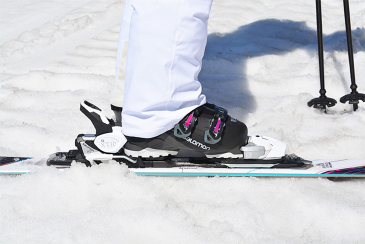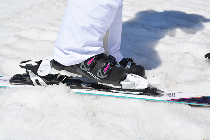 When you put on the ski, make sure to check the rear part of the binding. If the part that fastens your heel is down and the rear metal tab is up, you can't attach the boot to the ski. Push the metal tab down with a pole or hand to open the space for your heel and then place your boot onto the binding.