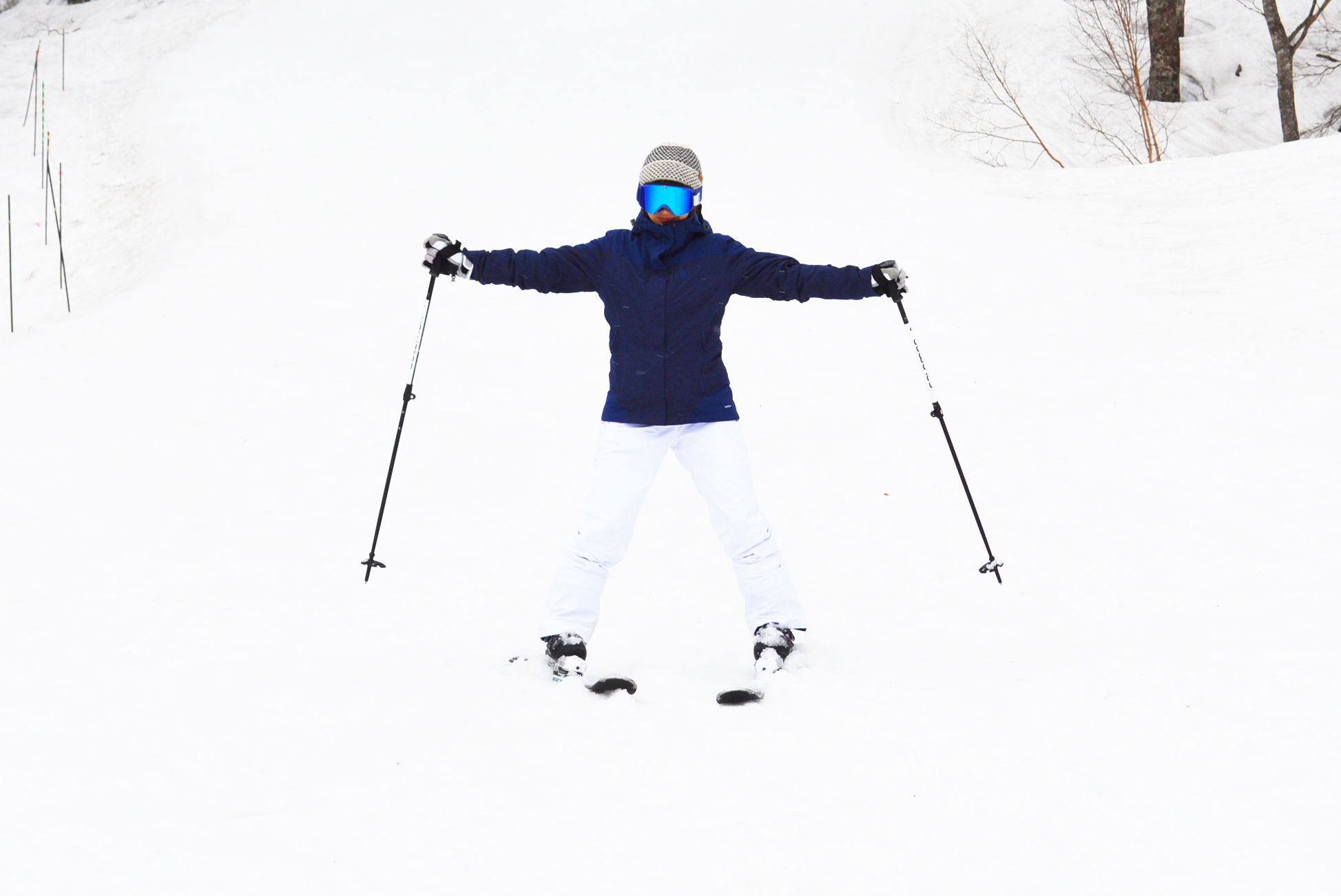 If you are tightening your muscles and your body is twisted, you won't have much control of your skis. Be sure to keep your weight right between your legs down the centerline of your body, regardless of whether you are skiing in a straight line or turning.