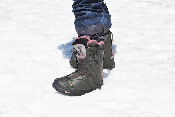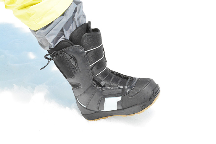 You'll be wearing special snowboard boots when snowboarding. Basically, they are composed of two layers - a tough outer layer and a well-fitting inner layer. The boots are tightened with a cord called a leash or a wire, and the shin area has a part called a tongue. These soft boots are made of nylon or leather to be highly waterproof and sturdy. While some hard boots made from plastic are available, most boots are soft like those shown here.
