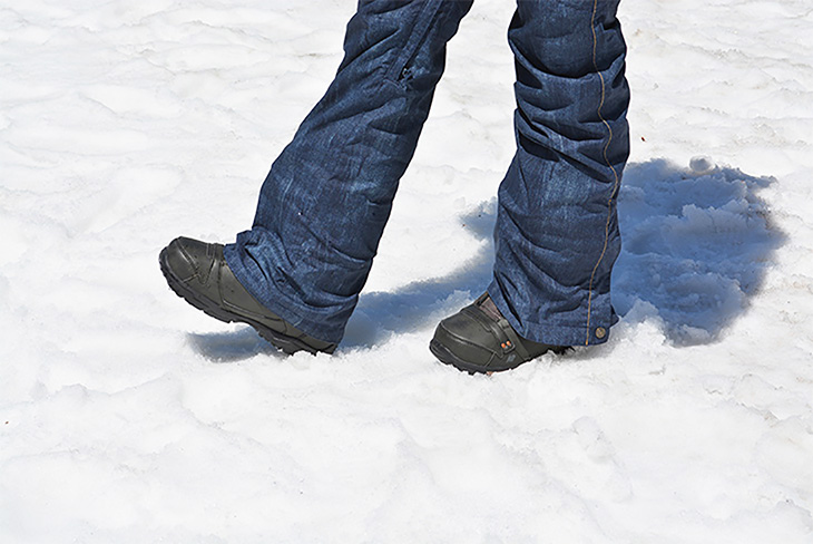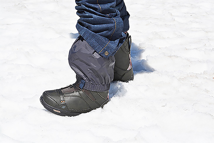 Tucking the powder guard into your boots like this is a mistake, as snow will get into your boots and they won't be tight enough. Remember that the powder guard should cover the outside of your boots.