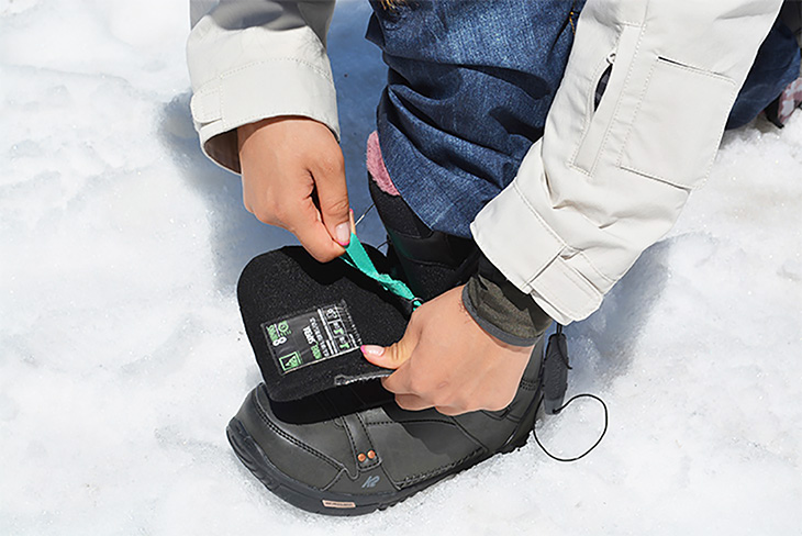 Once your feet are in the boots, pull the shoelace of the inner boots until just tight enough. The shoelaces usually have a handle or similar to make it easy to pull them.