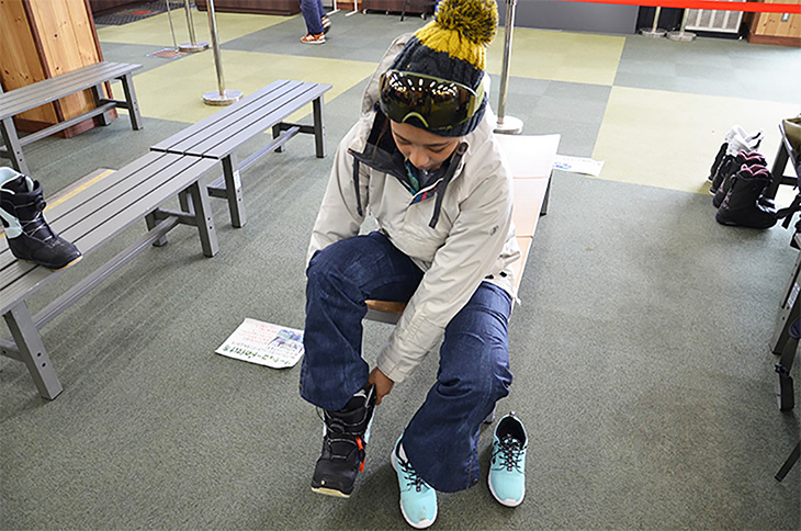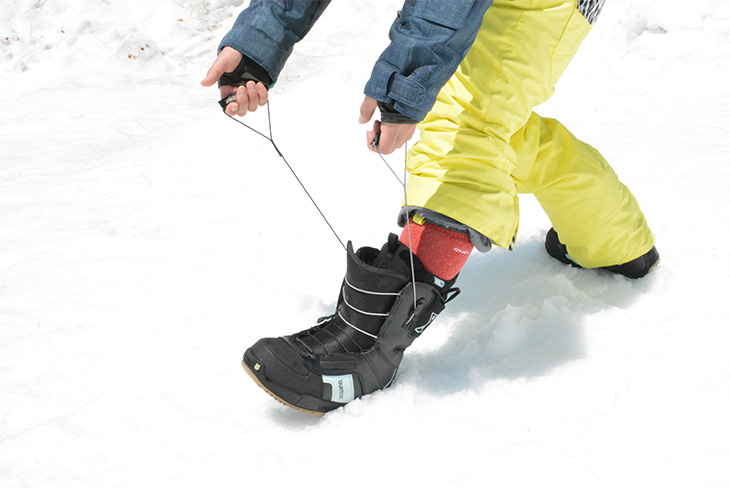 How to tighten the laces differs depending on the boot type. There are three broad types of boots: those with laces like sneakers, those you can easily tighten by pulling on a cord ("speed-shoelace type"), and those you tighten with a wire by twisting a dial ("BOA type"). Here, we will introduce how to fit and remove speed-shoelace and BOA-type boots.