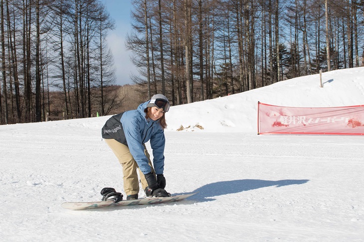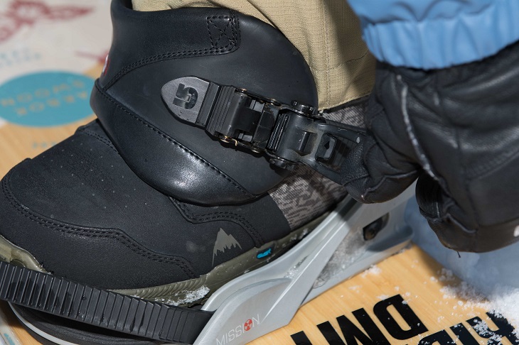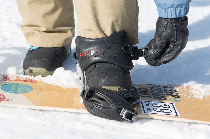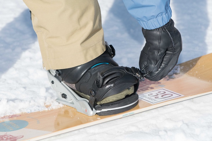 After tightening all the straps, firmly secure the ankle part of the boot. Shake off any snow that has adhered to the bottom of the boots or bindings before mounting as this will prevent proper attachment.