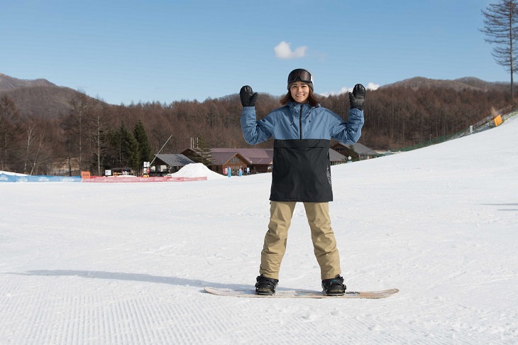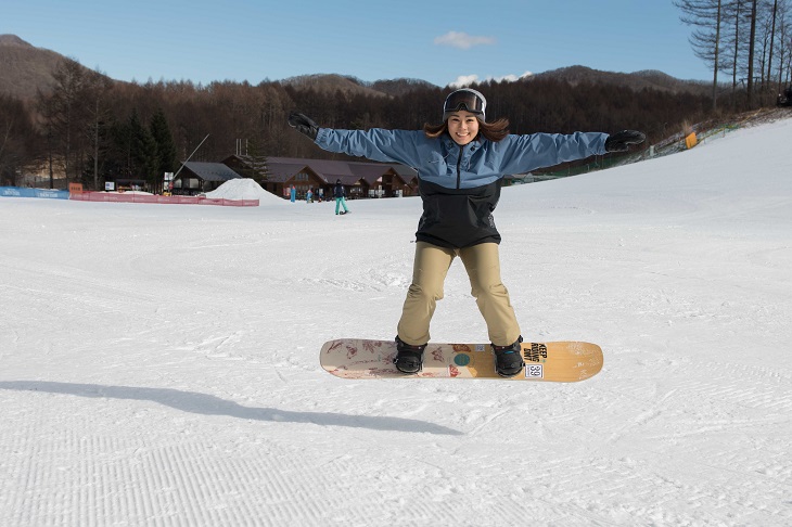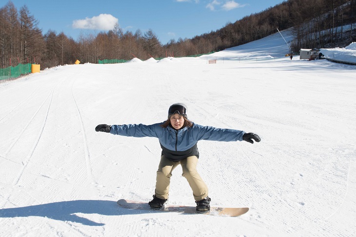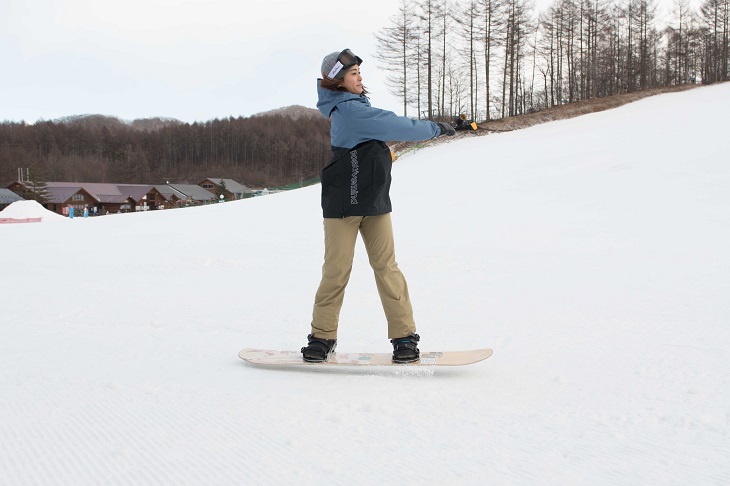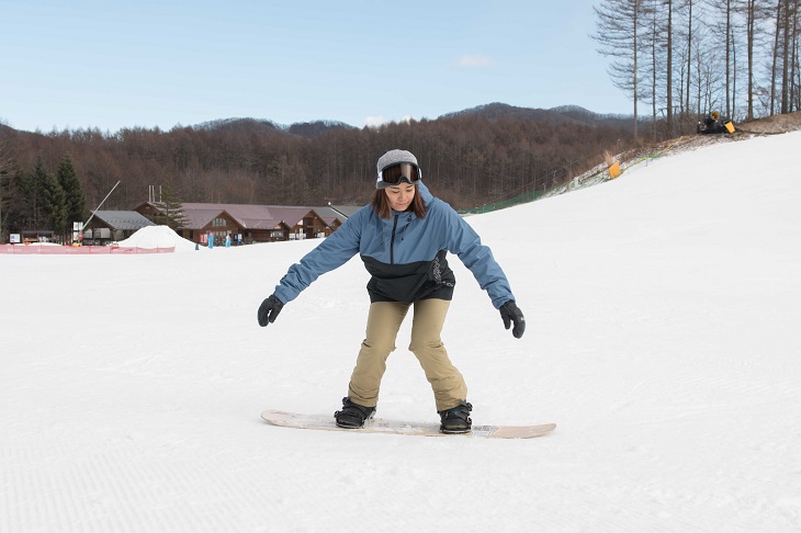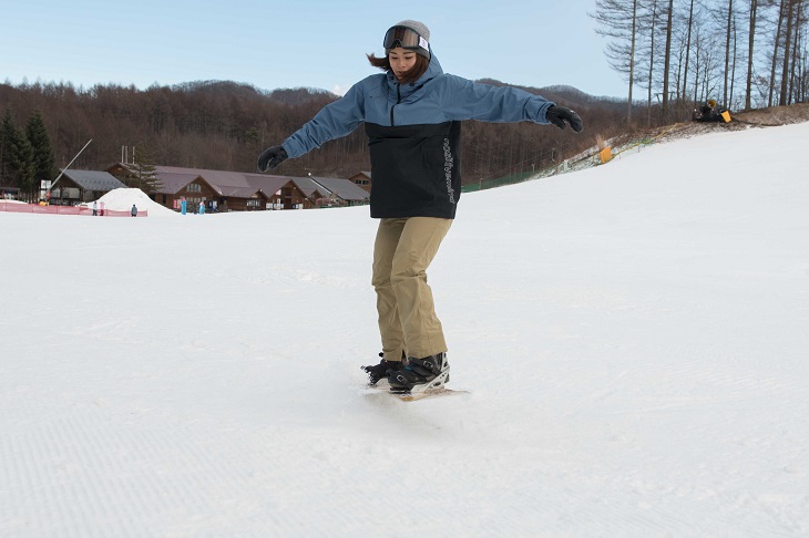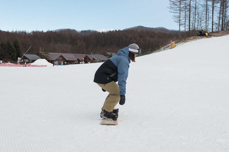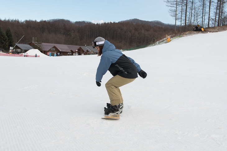 An important point in jumping correctly is making sure to bend the ankles and knees, lower the upper body, and strongly step into the jump. From jumping to landing, make sure that the snowboard is directly below your body.