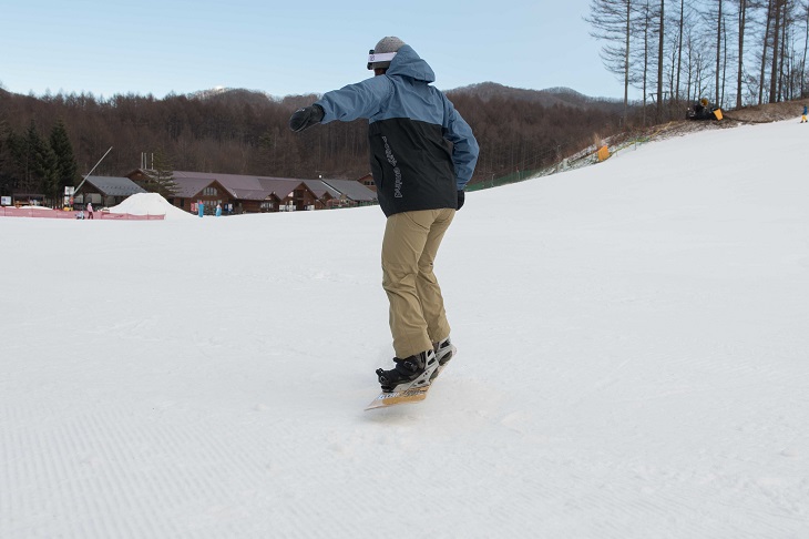 Also practice in the counter-clockwise direction. Face toward the tip of the snowboard and stretch out your hands. After crouching down, twist your upper body in the counter-clockwise direction.