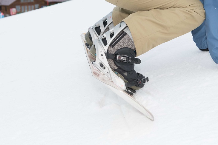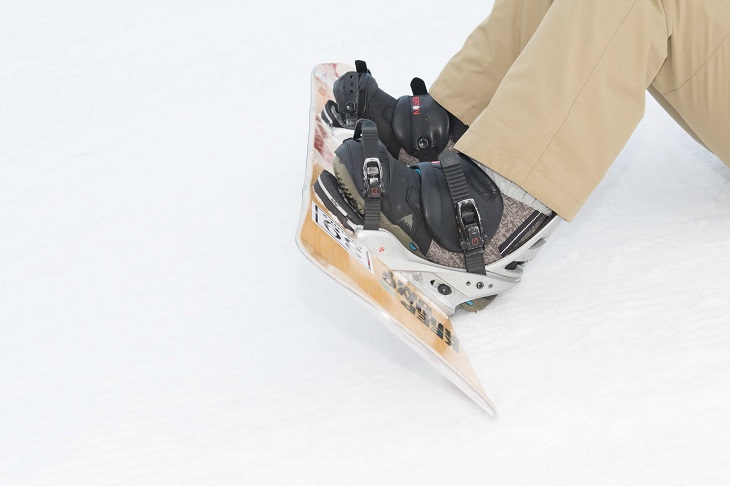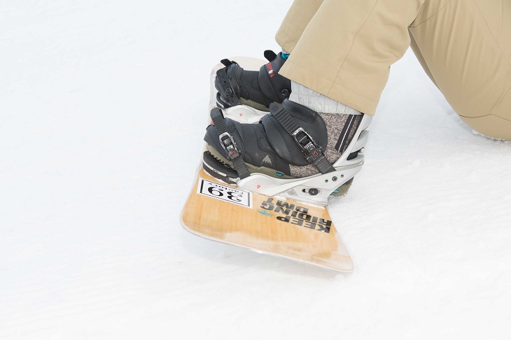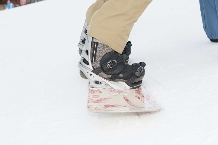 Here, we'll explain how to adjust the edge on the heel side. By lifting up the toes, the heel-side edge bites into the snow, putting the brakes on.