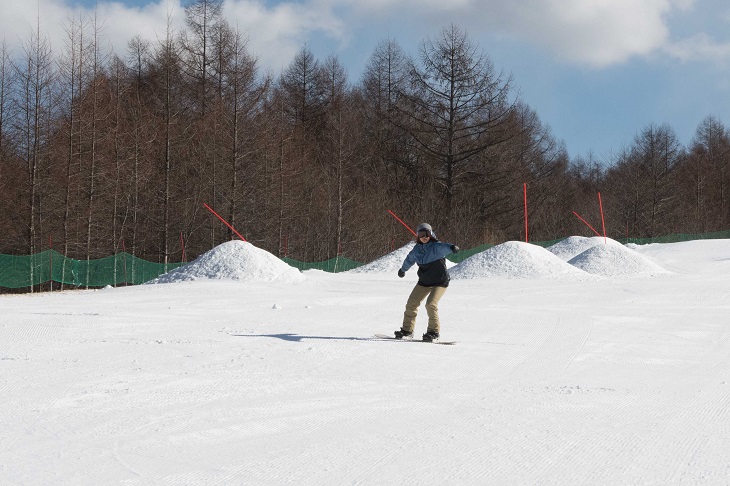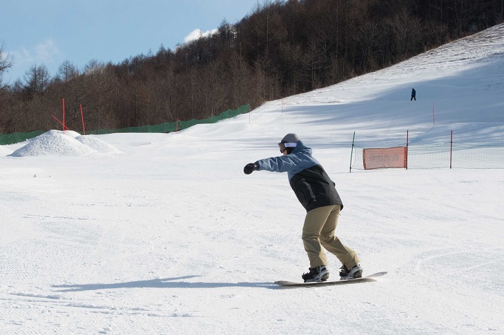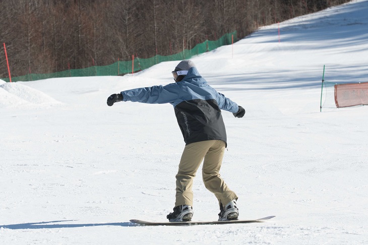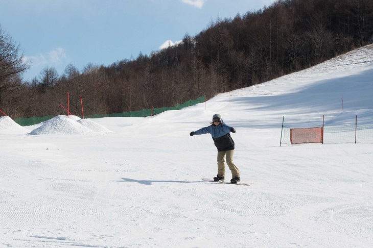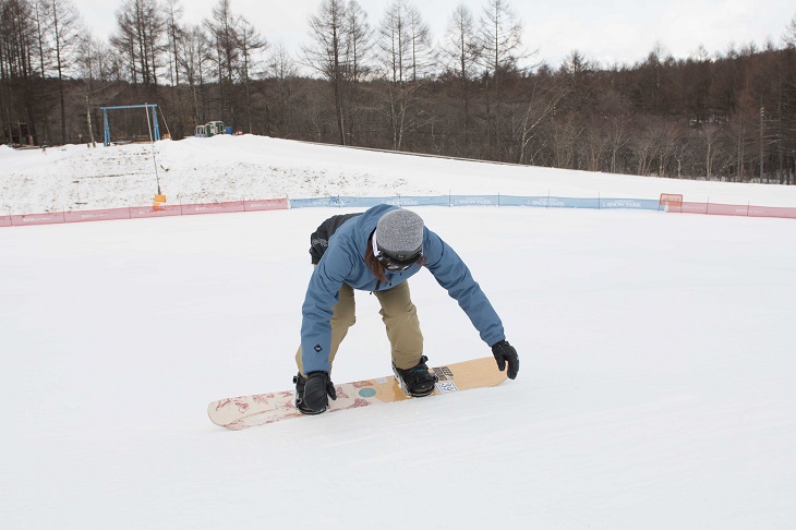 If you crouch down or lean backward, you'll pick up speed and may start sliding uncontrollably. Remember to use your ankles and knees and keep up with the movement of the snowboard. It's important to choose a gentle slope where you practice with peace of mind.