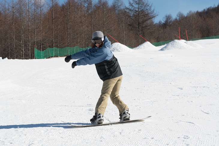 Kicking off with the back foot and bending it will cause your upper body to twist and restrict your movement, making it difficult to control the snowboard. When turning, imagine aiming your face and chest in the desired direction of travel.