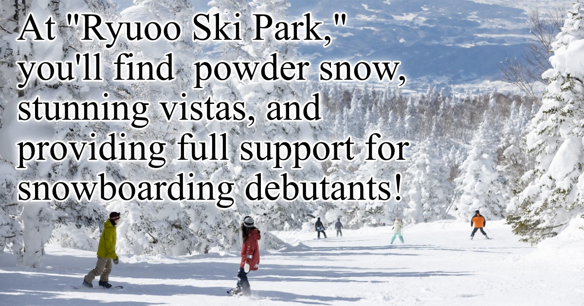 At "Ryuoo Ski Park," you'll find powder snow, stunning vistas, and providing full support for snowboarding debutants!