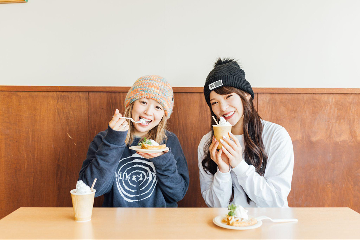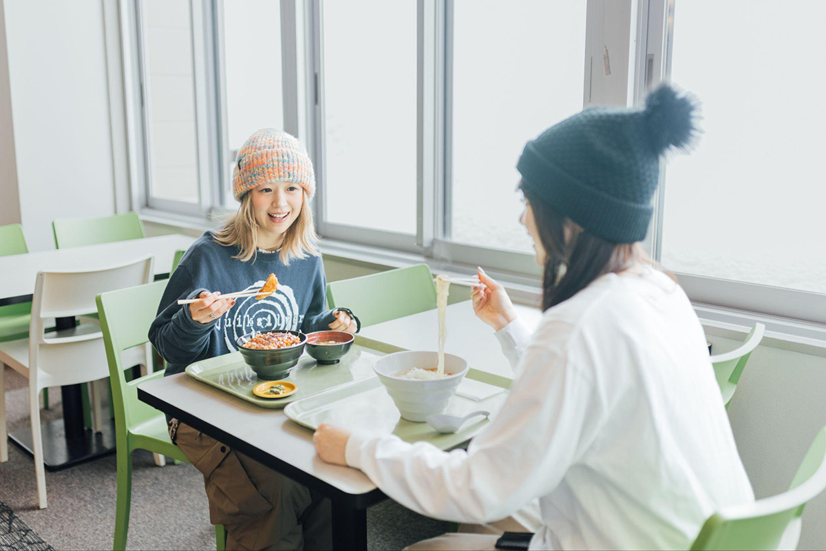 Okay, we've had our fill of epic powder, so now it's time to chill out with some lunch at "Buna Buna." The snowy scenery outside the window is super calming. Just perfect.