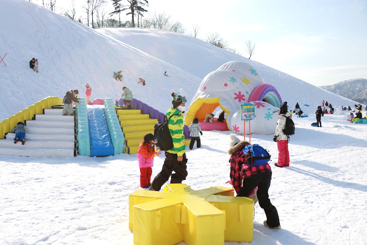 Grand Snow Okuibuki offers a fun and comfortable environment for families with children. The largest kids' park in Japan features a spacious area where kids can enjoy sledding, snow play, and mountain play. A popular feature is the free sled rental. With food-equipped moving walkways, it's easy to get up the slopes, making it hassle-free for parents. Kids can enjoy a wide variety of activities like making snowballs, building igloos, sliding down hills, and jumping on fun play items.