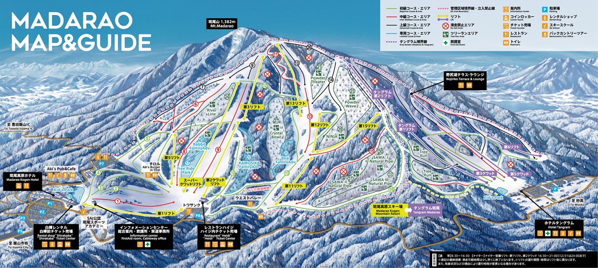 Along with Nozawa Onsen, Madarao Kogen is well known as one of the areas with the heaviest snowfalls in north Nagano. The ski runs spread from the summit of Mt. Madarao in the shape of a fan, with the unique course layout skillfully making use of the mountain's terrain to offer very steep to gentle runs. The resort offers a full range of unpressed areas and tree runs down wooded areas, which are a wonderful opportunity to ski or snowboard down the huge field all you like surrounded by winter nature. The ski resort stands next to resort hotel "Madarao Kogen Hotel."