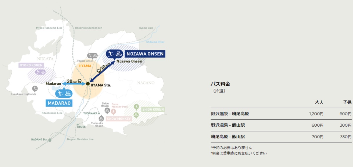 During the winter season, there is one bus each in the morning and afternoon running from Nozawa Onsen to Madarao Kogen via Iiyama Station, and from Madarao Kogen to Nozawa Onsen via Iiyama Station. Booking is not required, anyone can board the bus from the bus stop, with a single adult ticket reasonably priced at 1,200 yen between Nozawa Onsen and Madarao Kogen. Just sit back and enjoy your ride in the large bus and the bus takes you from one ski resort to another in about an hour. What better way to travel?