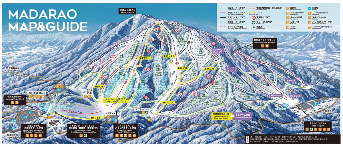 在斑尾山東北斜面擁有多達 32 條多樣化雪道,從初級到高級者都能盡情享受,其中樹林滑行雪道數量更是日本頂級規模。豐富的降雪亦是一大魅力,被稱為「madapow(斑尾粉雪)」的極致粉雪,吸引了來自海外的大量滑雪者與單板玩家。