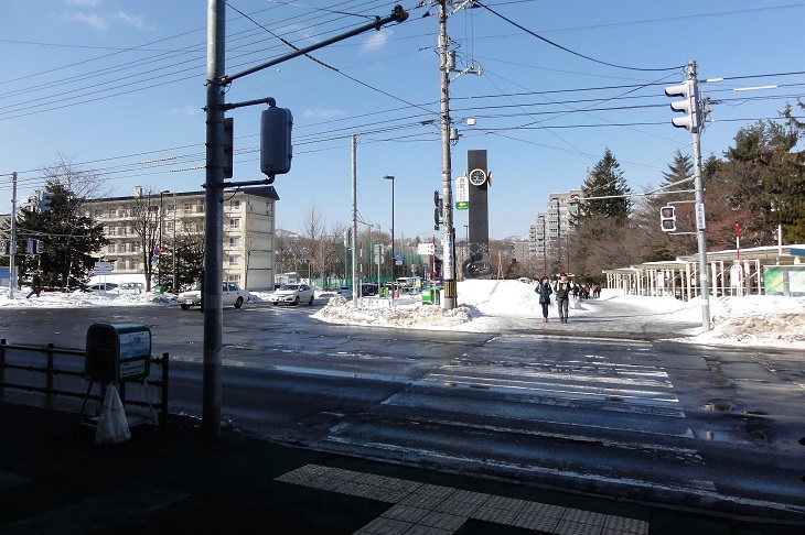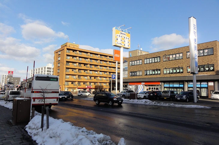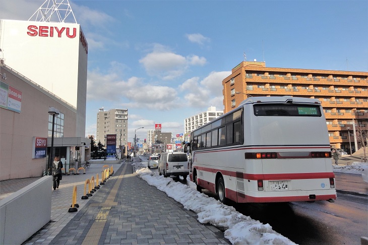 Once you reach the street level at exit 5, turn around to face in the opposite direction and walk straight. In the photo above, you see the exit, and once you emerge from the exit, walk straight toward the blue bus. Continue in that direction for two or three minutes, walk past the Seiyu supermarket on your right, and you'll arrive at the bus stop in front of the Sorachi Shinkin Bank signboard.