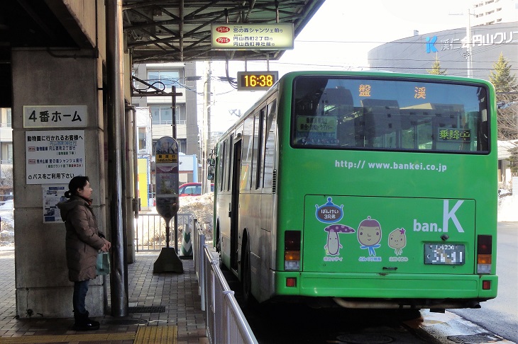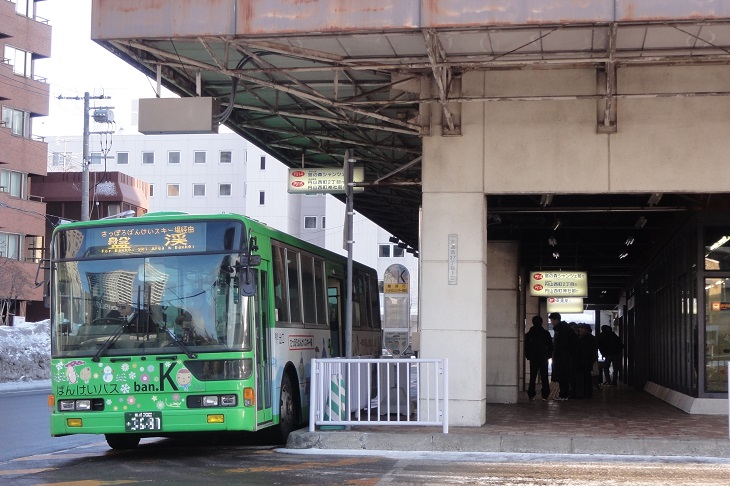 Buses to other destinations also depart from platform 4 so be careful. Be sure not to blindly follow people with ski-jump gear, as they get on the bus to a ski-jump venue that's in a different place. Your Bankei Bus is green and "ban.K" is written across the bus in large letters.