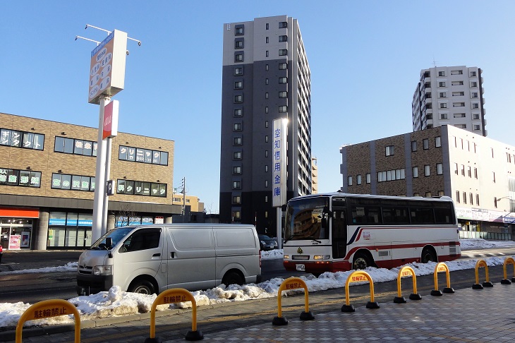 There is no physical bus stop, and the only sign indicating the bus stop is that of the Sorachi Shinkin bank. If you are not familiar with the area or cannot read Japanese characters, it can be quite puzzling so use these photos for your reference.