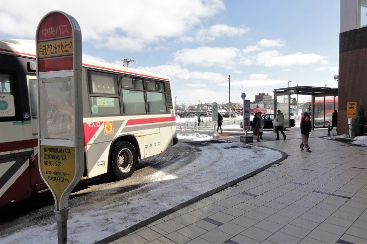 Kitahiroshima Station is located between Sapporo Station and New Chitose Airport Station. Rapid trains also stop there. Once you leave the train and the exit, go downstairs to west exit 1, where you'll see the Chuo Bus bus stop. The bus takes about 20 minutes to Mitsui Outlet Park Sapporo Kitahiroshima.