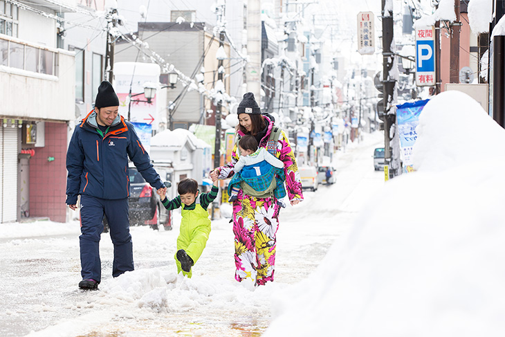 If you want to enjoy not just winter sports but also sightseeing, why not stay in the onsen town around the station? There are many things for you to enjoy, like souvenir shops, restaurants and onsen centers. In the winter, snow stands like a wall on both sides of the streets, with all the atmosphere of genuine snow country.
