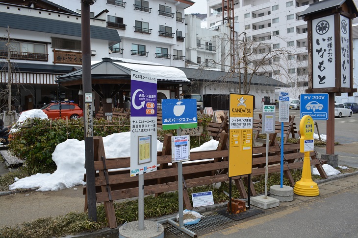 There's a shuttle bus service that takes you directly to the ski resorts around Yuzawa, departing from Echigo Yuzawa station and nearby areas. There are several bus stops in front of the Echigo no Oyado Inamoto Hotel, about two minutes' walk from the west exit of Echigo Yuzawa station. The shuttle buses take you to Yuzawa Kogen Ski Resort, GALA Yuzawa Snow Resort, NASPA Ski Garden, Yuzawa Nakazato Ski Resort, Kandatsu Kogen Ski Resort, Yuzawa Park Ski Resort, and Ishiuchi Maruyama Ski Resort.