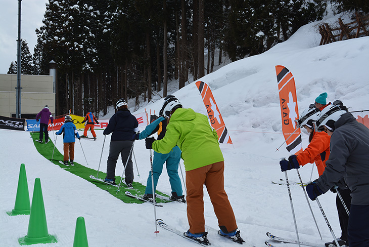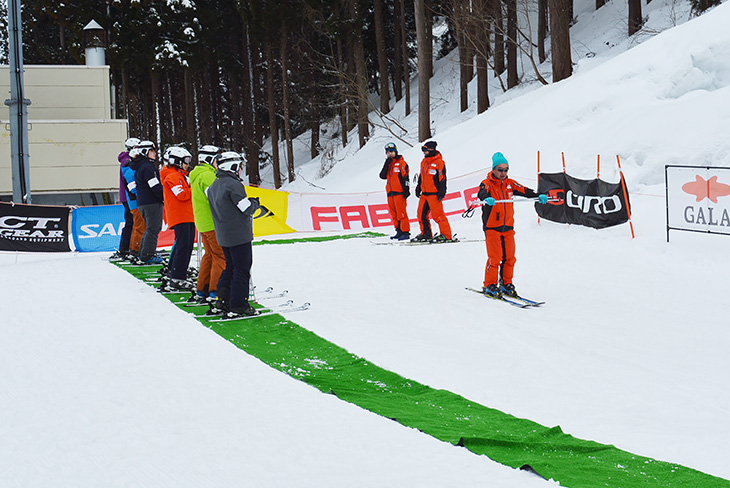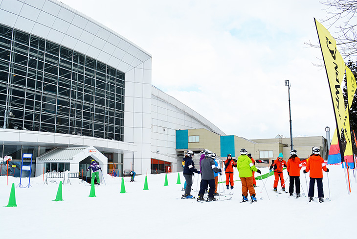 You'll begin by getting used to skis, walking on a flat snowy surface with skis, and pushing yourself forward with poles. Once you get familiar with the sense of skiing, you'll learn how to ski down a gentle slope. The slope includes an artificial lawn sheet off to the side so you can walk up it with your skis on.