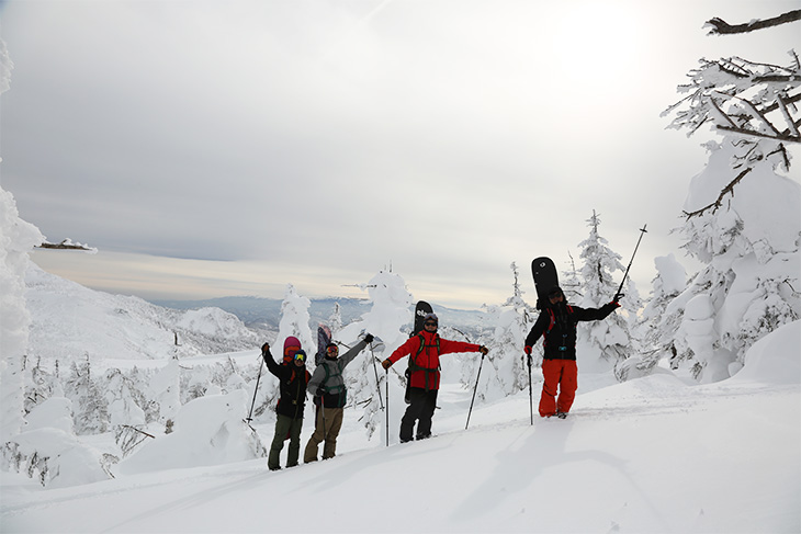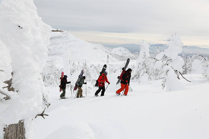 M’s Guide & School in the Miyagi Zao Sumikawa Snow Park holds “cat tours” that take participants on a one-way caterpillar vehicle ride up into mountains. This tour takes you to an upper part of Mt. Katta by snowcat. From there, you can choose between a snowshoe tour to walk in the ice monster field with snowshoes on, and a back-country tour to ski or snowboard down the mountain (reservation required). Both tours are led by guides for your safety. The tour season runs from late December to late March.