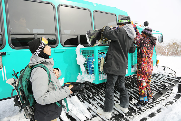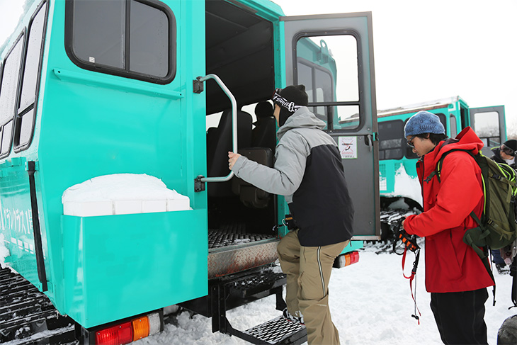 Register for the tour at the school on the ski piste. Before leaving the school, you'll need to fill out mountaineering plans and listen to accompanying guides’ explanations at the school, and rent back-country gear (backpack, snowshoes, beacon, extendable poles) if you don't already have your own. There's also a store that rents clothes and ski- and snowboard-related gear in the same building; visiting empty-handed and renting everything from them is a convenient option. When everyone is ready, the guides will lead your group to the snowcats.
