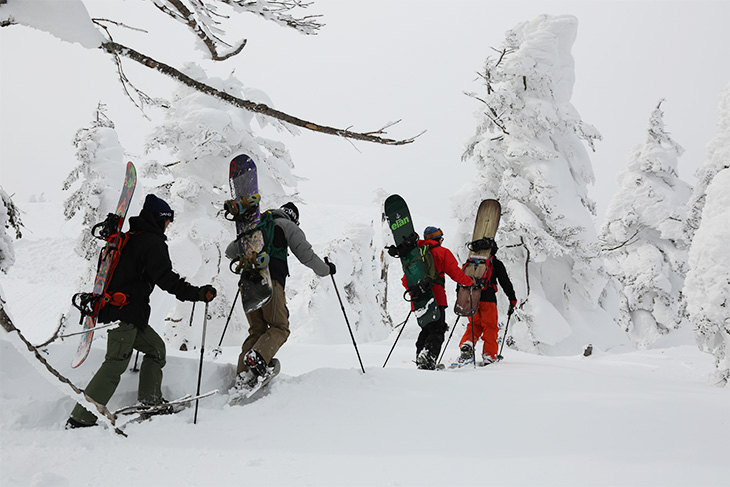 A range of courses are available to suit your skill level and interests. There's an entry-level course where you ski or snowboard from the drop-off point back down to the piste (5,300 yen for about two hours). Or perhaps take the step-up option where you'll ski down, hike back up the slope, and ski down again to the piste (7,300 yen for about three hours). For the more adventurous, there's an original course that an experienced guide selects on the day according to the conditions (9,300 yen for about three hours). Guides are happy to advise you on choosing a course.
