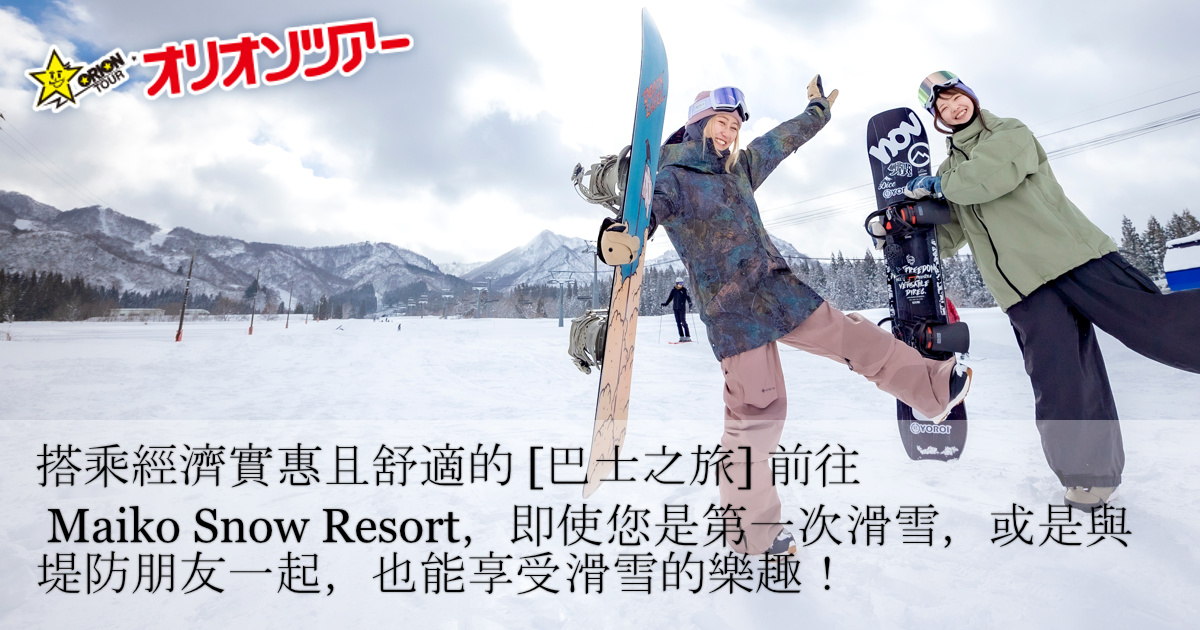 搭乘經濟實惠且舒適的 [巴士之旅] 前往 Maiko Snow Resort,即使您是第一次滑雪,或是與堤防朋友一起,也能享受滑雪的樂趣!
