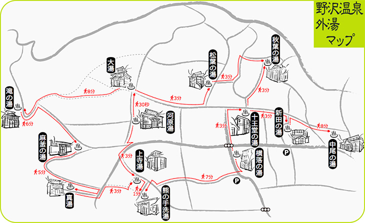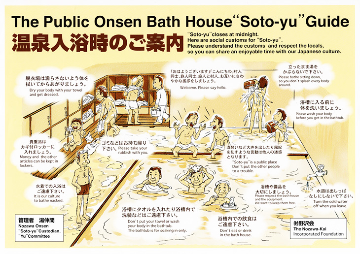 During the opening hours, anyone can freely enjoy the public baths in Nozawa Onsen. But since local residents (a group called Yunakama, meaning "onsen friends") clean and maintain the baths, pay the utilities and conserve the buildings, we as tourists must remember to use the baths in ways that don't inconvenience the residents. Though this is common sense, make sure to stick to public bath manners, like washing yourself thoroughly before soaking in the bath, and wiping yourself dry before entering the change area after bathing.