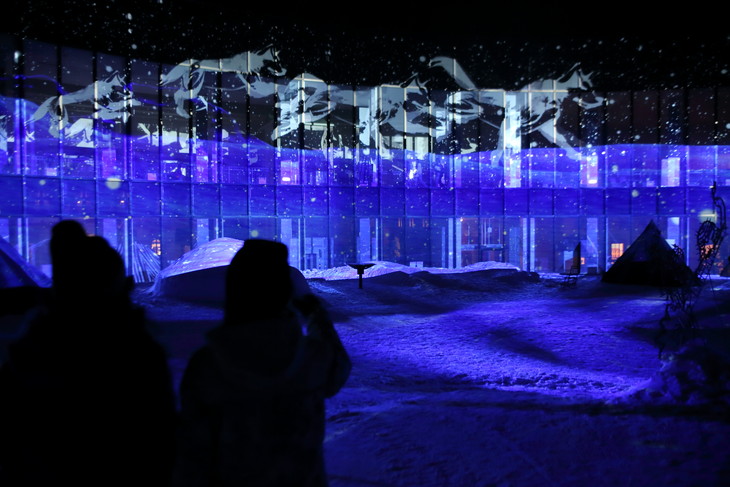 A magnificent storytelling show about the Ainu adorns the street at night.