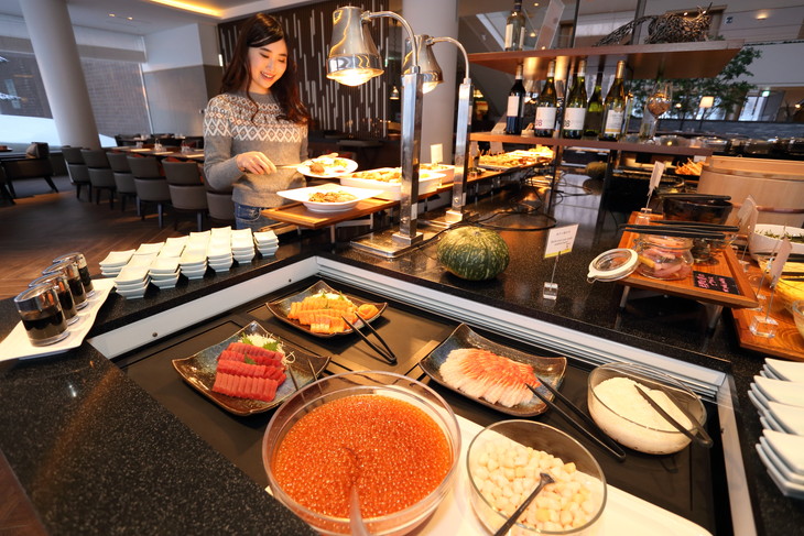 For dinner, why not try signature dishes like the roasted Ezo venison with roasted root vegetables and honeysuckle sauce, as well as classic Hokkaido foods such as fresh raw fish and salmon roe, served in a buffet-style setting.