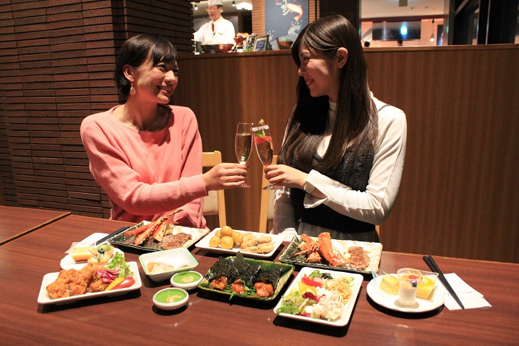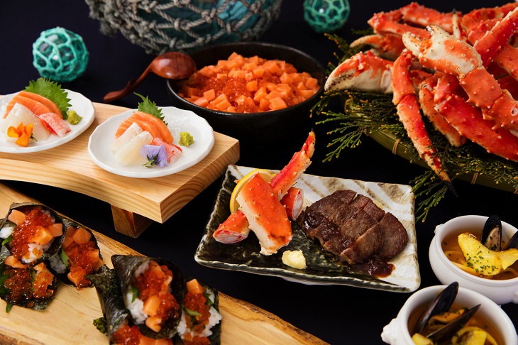 Buffet Dining hal at Hotel Alpha Tomamu has several dozen dishes on the menu, including crab and beef grilled on an iron plate, hand-rolled salmon and salmon roe sushi, sashimi, and a whole array of appetizers to desserts.