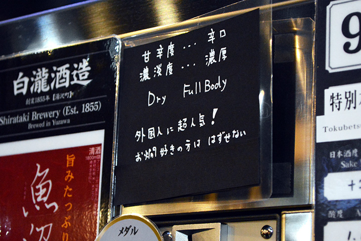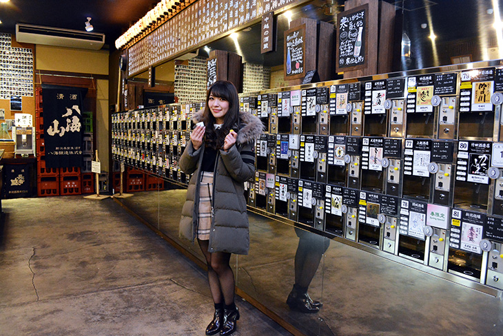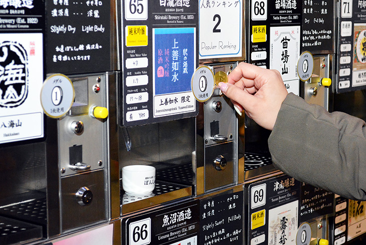 Just buy five tokens at the reception desk, put your sake cup in the machine, and insert a coin. When you press the button the machine will dispense cold sake into the cup. Each machine carries a card explaining each sake's character, explaining whether it's sweet, dry, refreshing, rich, and so on. It's a useful guide for choosing your favorite sake. (Some sake requires two tokens.)