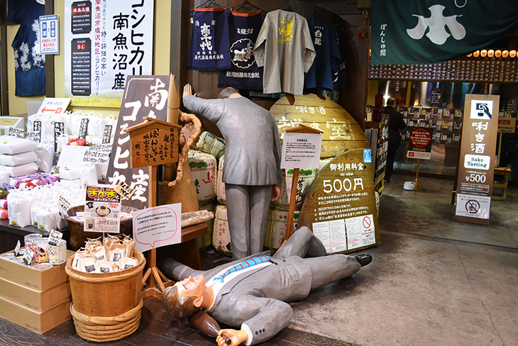 To find the sake sampling section, look for the drunk dummies in front of the entrance and have a laugh!