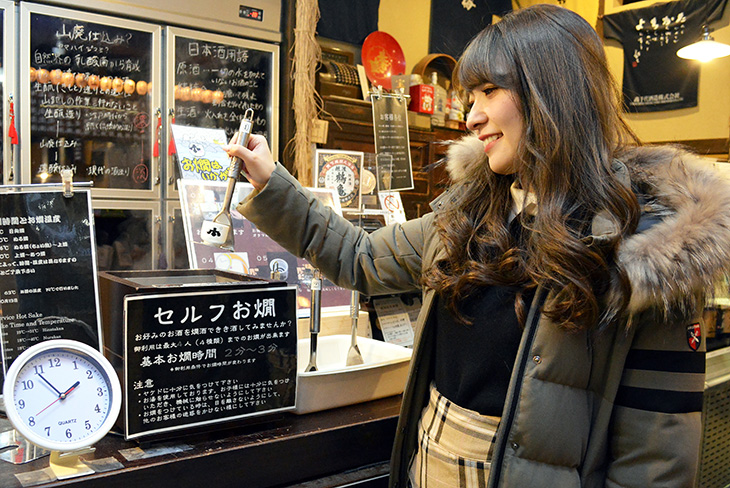 There are many ways to enjoy sake, hot or cold. The machine dispenses chilled sake, but you can also warm it up. Simply place your sake cup gently in the hot water and it will be just right in two to three minutes. Experience the many ways of enjoying sake.