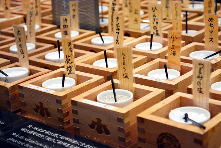 Sake can also be enjoyed with salt. In the sake sampling section there are many types of salt from different regions in Japan, from very savory to faintly sweet. It's fun to think about which salt to pair with your sake.