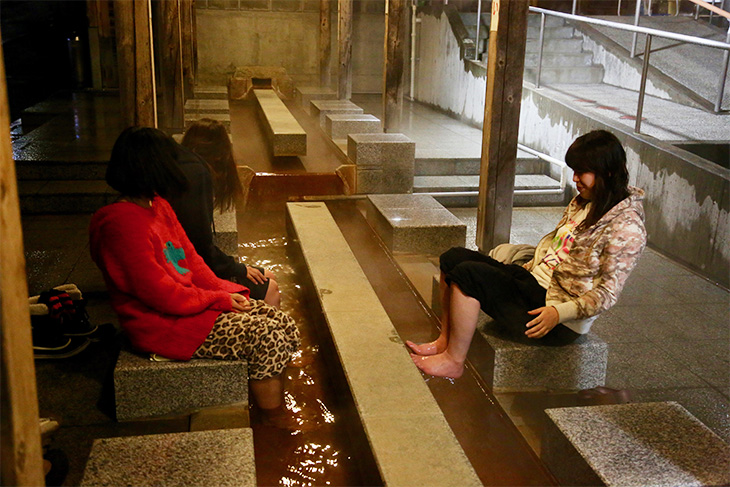 There is also a free foot bath outside the Kami no Yu building. Hot water comes from the spout at a temperature as high as that of the source, which is dangerous. The best place to sit is on the tourist information center side, which is far enough from the spout for the water to cool to a comfortable temperature. No towels are available at the foot bath, so you'll need to bring your own.