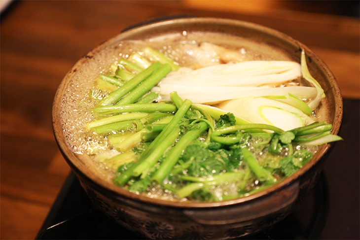This hotpot dish contains chicken soup stock and whole water dropworts from root to leaf tips, whose crunchy texture is addictive. This is a must-eat food for visitors to Miyagi.